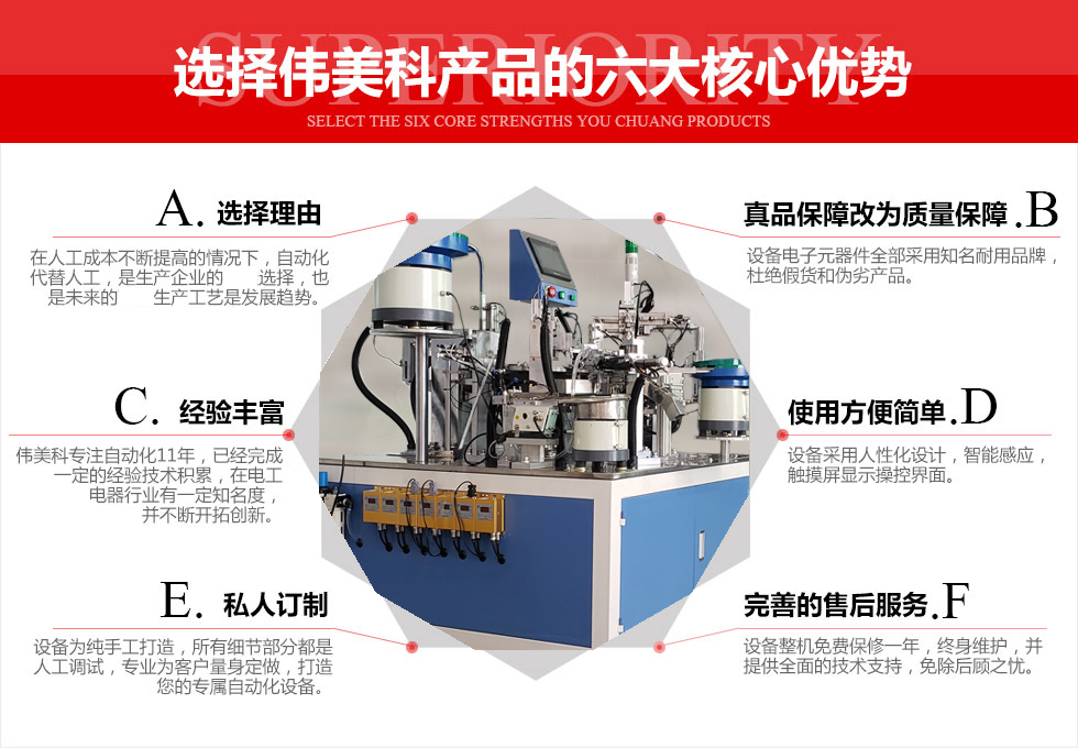 深圳市偉美科自動(dòng)化設(shè)備有限公司創(chuàng)建于2003年,生產(chǎn)地位于改革開放前沿陣地--深圳,處水官高速、深汕高速、機(jī)荷高速路口,地理位置交通十分便利,公司現(xiàn)有員工30多人,專業(yè)技術(shù)人員12人,生產(chǎn)設(shè)備工具一應(yīng)俱全,專業(yè)為客戶提供開發(fā)、設(shè)計(jì)、制造各種非標(biāo)自動(dòng)化設(shè)備、自動(dòng)化生產(chǎn)線、自動(dòng)送料系統(tǒng)等解決方案,產(chǎn)品主要適用于五金、塑膠、玩具、電子、電器開關(guān)插頭插座、連接器行業(yè),其主要產(chǎn)品有:全自動(dòng)鉆孔攻牙機(jī)、自動(dòng)上螺絲機(jī);銅件、銅片、銅釘、雞眼類自動(dòng)鉚接機(jī);開關(guān)觸點(diǎn)自動(dòng)鉚接機(jī)、五金類自動(dòng)裁斷、鉆孔、攻絲機(jī);各類電工插頭、插座全自動(dòng)組裝機(jī);RCA...